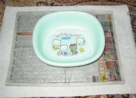 じゅうたんの上にバスタオルをひいて、その上に新聞紙をおきます。